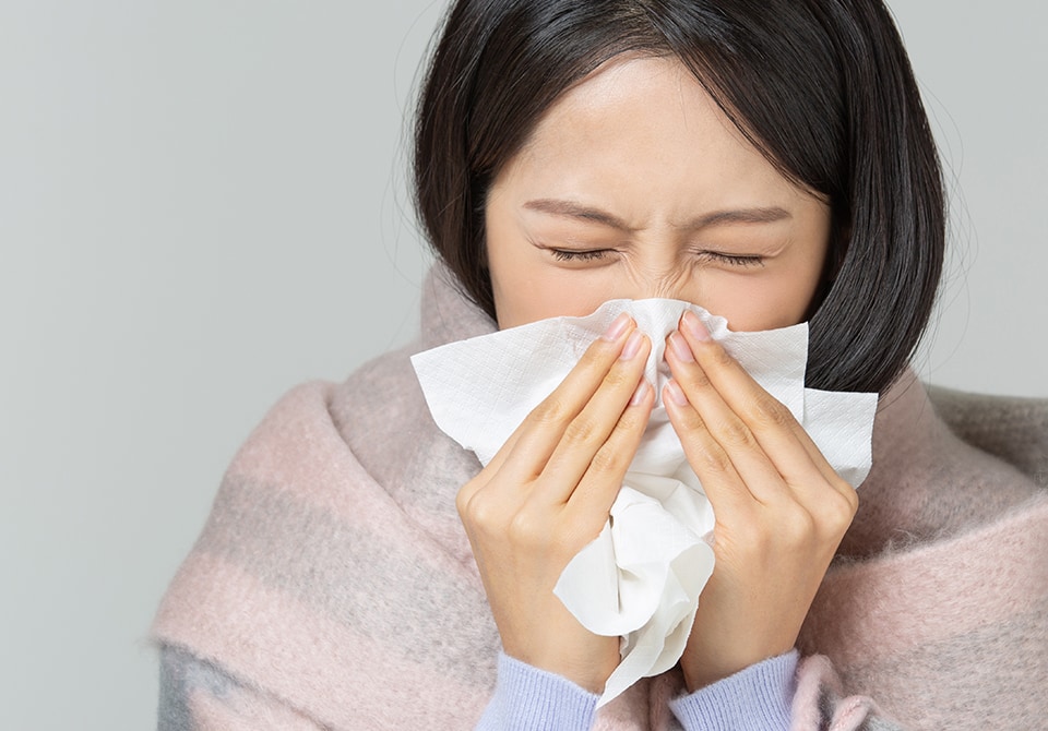 - 권태감, 두통, 미열과 함께 코 막힘, 콧물과 안면 부위의 통증